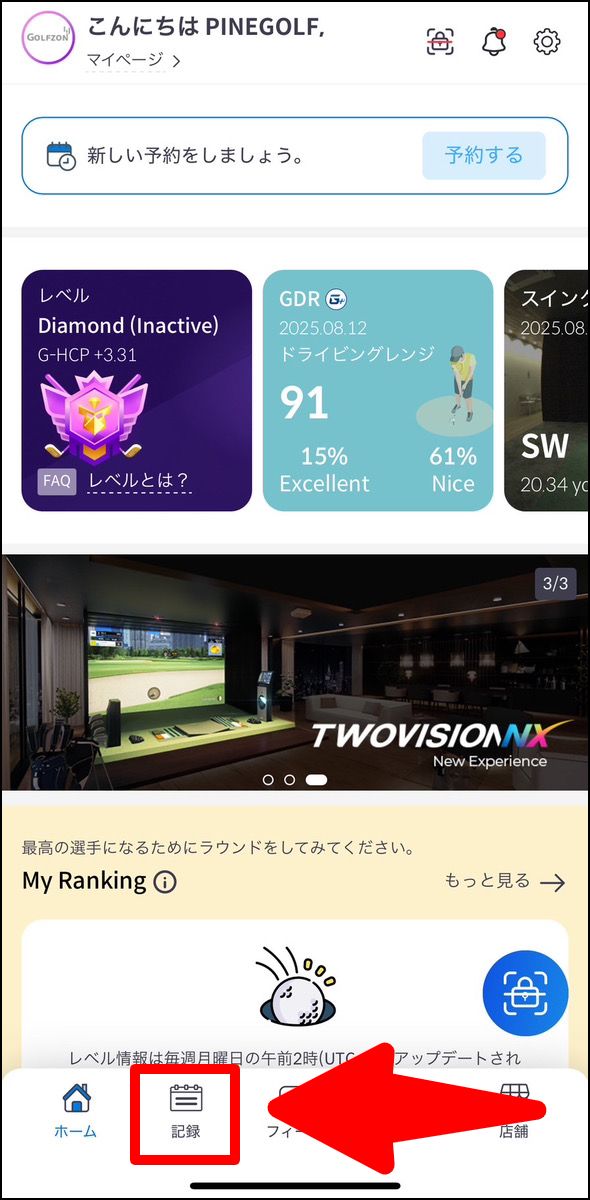 アプリ下部メニューの「記録」をタップすると、スコアやスイング映像を確認できます。